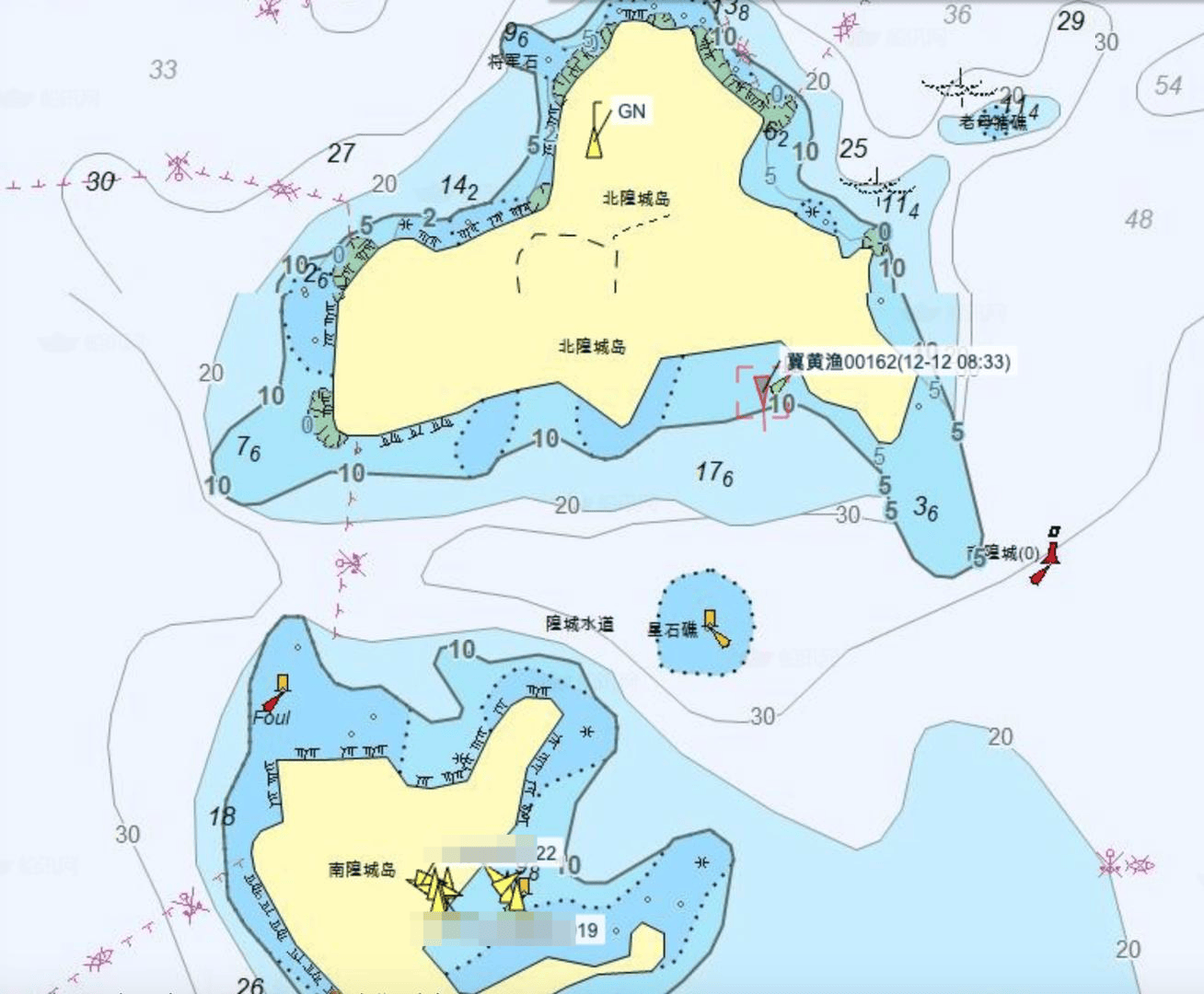 此外,“冀黄渔00162号”记录的最后位置,靠近北隍城岛的浅海区域,水深线为10米。