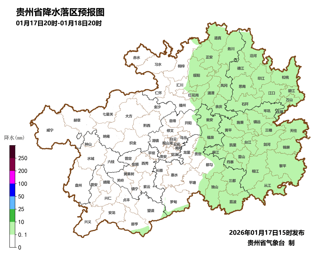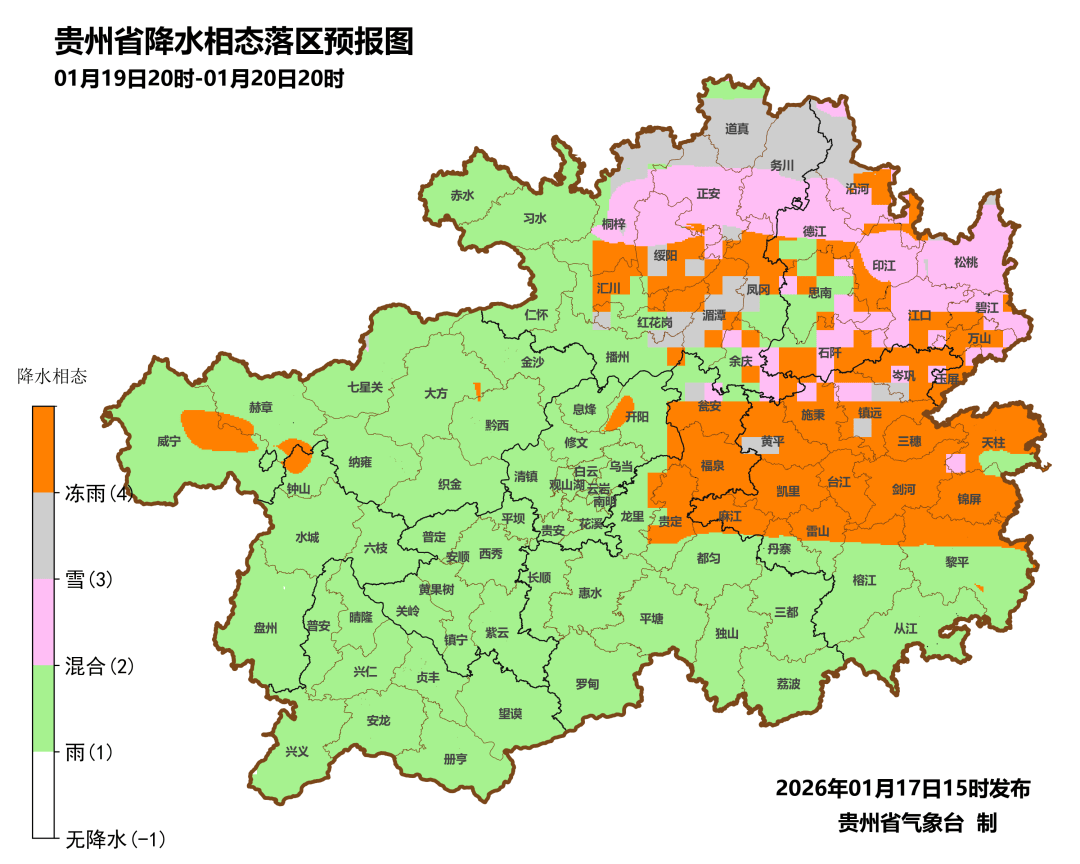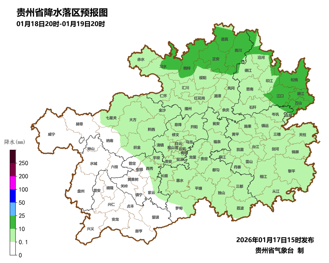 01月16日08时至01月17日08时,中雨出现在黔东南州的锦屏、黎平2县域内的3个观测站(乡镇最大为黎平县高屯街道中黄村12.3毫米),小雨有124个观测站;毕节市的赫章县最低气温在0℃及以下(-0.1℃);15县出现大雾(毕节市的黔西,贵阳市的乌当、修文、清镇,遵义市的正安、绥阳、赤水,铜仁市的德江、思南、沿河,黔东南州的锦屏、黎平,黔南州的贵定、龙里,黔西南州的普安),最低为锦屏县43.0米。