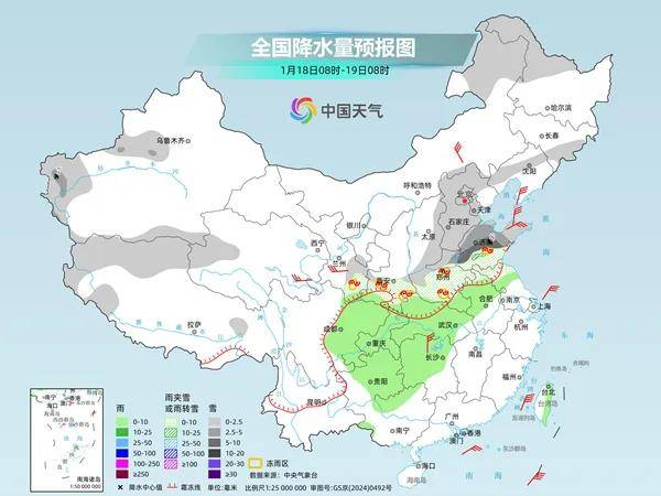 今天起,随着寒潮影响展开,中东部地区自北向南将先后出现大范围雨雪天气过程,秦岭—淮河以南地区降水相态复杂,有雨雪及冻雨的转换:西北地区东部、华北南部、黄淮、江汉、江淮西部、江南北部等地有中到大雪或雨夹雪,其中,陕西南部、山西南部、河南、山东、湖北中西部、湖南北部、安徽等地部分地区有暴雪,河南中南部、湖北西部、湖南、贵州、重庆东北部等地部分地区有冻雨,西南地区东部、江南南部、华南西部等地有小雨。