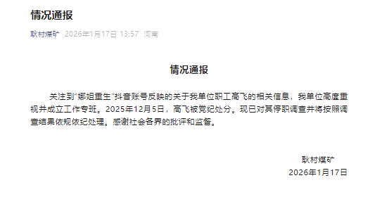关注到“娜姐重生”账号反映的关于我单位职工高飞的相关信息,我单位高度重视并成立工作专班。2025年12月5日,高飞被党纪处分。现已对其停职调查并将按照调查结果依规依纪处理。感谢社会各界的批评和监督。
