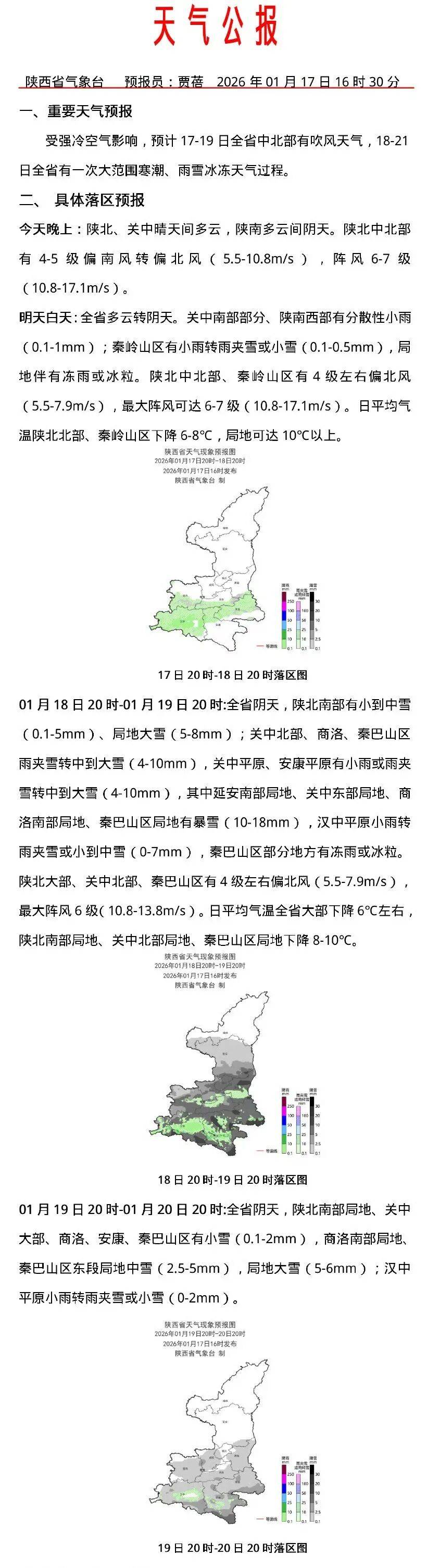 西安市气象台2026年1月17日16时发布天气预报:受强冷空气和南支槽东移共同影响,18日午后至20日夜间我市将迎来一次大范围雨雪冰冻、降温、吹风天气过程。