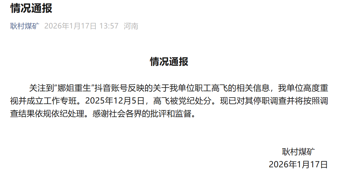 关注到“娜姐重生”抖音账号反映的关于我单位职工高飞的相关信息,我单位高度重视并成立工作专班。2025年12月5日,高飞被党纪处分。现已对其停职调查并将按照调查结果依规依纪处理。感谢社会各界的批评和监督。