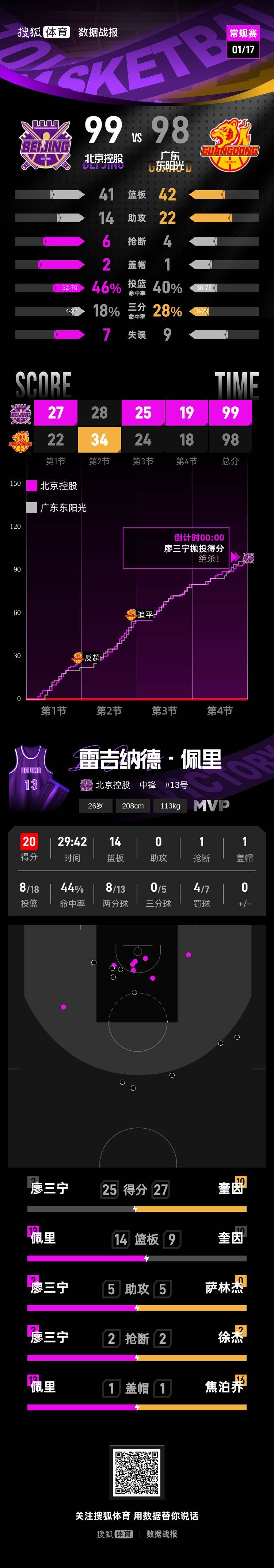 【搜狐体育战报】北京时间1月17日CBA常规赛第16轮,凭借着廖三宁最后时刻的抛投绝杀,客场作战的北京控股以99-98险胜广东东阳光。雷吉纳德·佩里20分14篮板0助攻,特雷维林·奎因27分9篮板3助攻。
