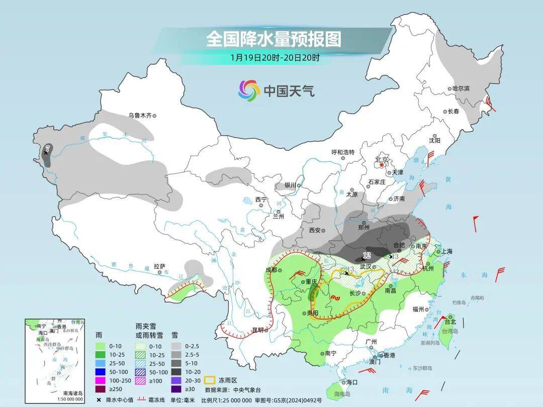 此外,在寒潮和暖湿气流交汇之下,中东部地区大范围雨雪冰冻天气也会随之上线,影响范围和强度均为今冬之最,届时雨雪分界线将向南推进到江南中部,19日是最强时段。