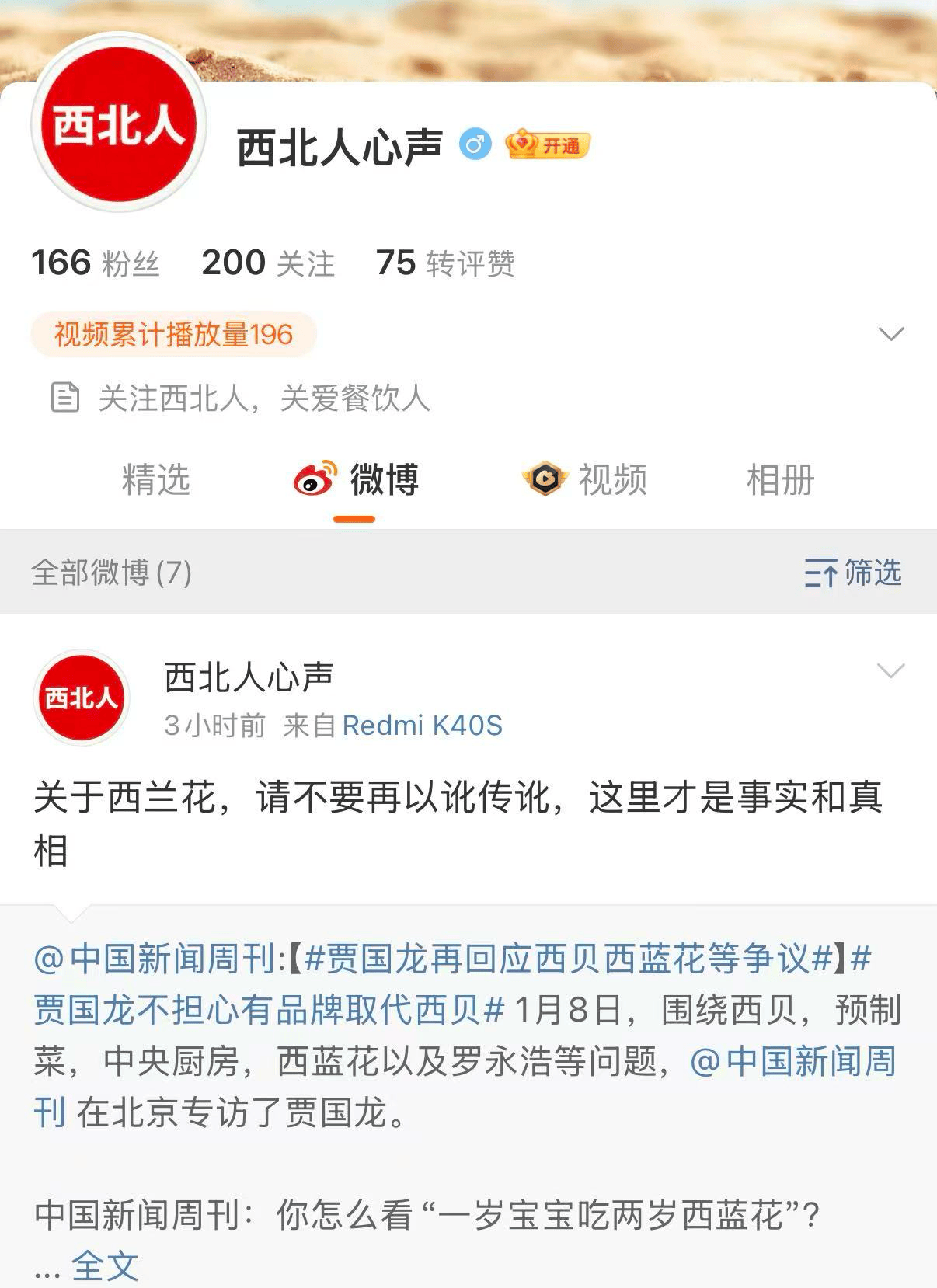 值得一提的是,南都记者注意到,在 @西贝人心声 发文后,微博平台有其名字相接近的另一账号 @西北人心声 接连转发推文支持西贝。不过,该账号发文所用机型和属地均区别于贾国龙,前者使用红米发于河北,而贾国龙发文通过华为发布自内蒙古。1月17日,这一账号也在持续转发更新支持西贝的相关内容。