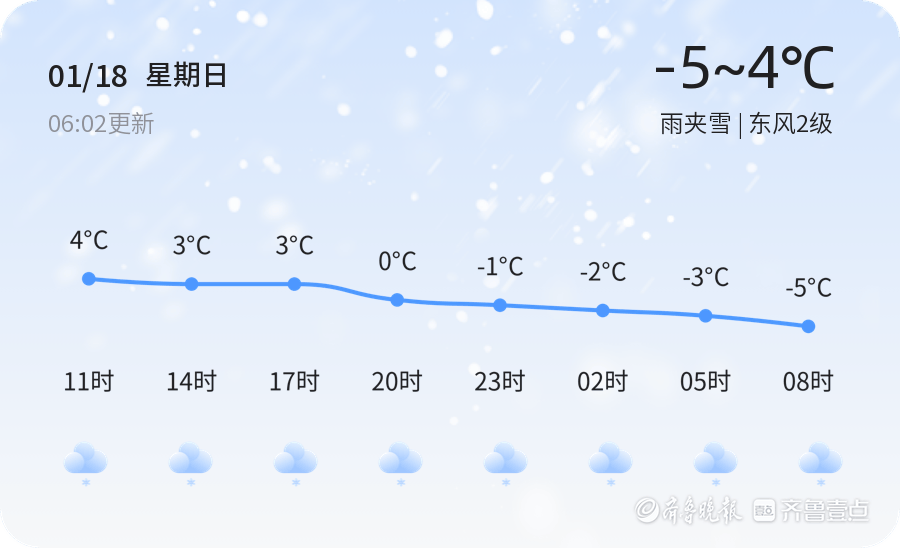 今天是1月18日,星期日,农历十一月三十。枣庄市迎来雨夹雪天气,气温为-5℃到4℃,东风2级,空气湿度93%。空气质量方面,PM2.5指数为49,属于良好水平。市民出行时请注意防寒保暖,雨雪天气道路湿滑,建议减速慢行,确保行车安全。