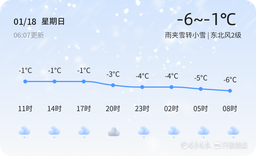 今天是1月18日,农历十一月三十,州市今天迎来雨夹雪天气,气温在-1℃到-6℃之间,东北风2级,空气湿度较高,达到94%,PM2.5指数为44,空气质量良好。全市各区均出现雨夹雪转小雪的天气状况,市民出行请注意防滑保暖。