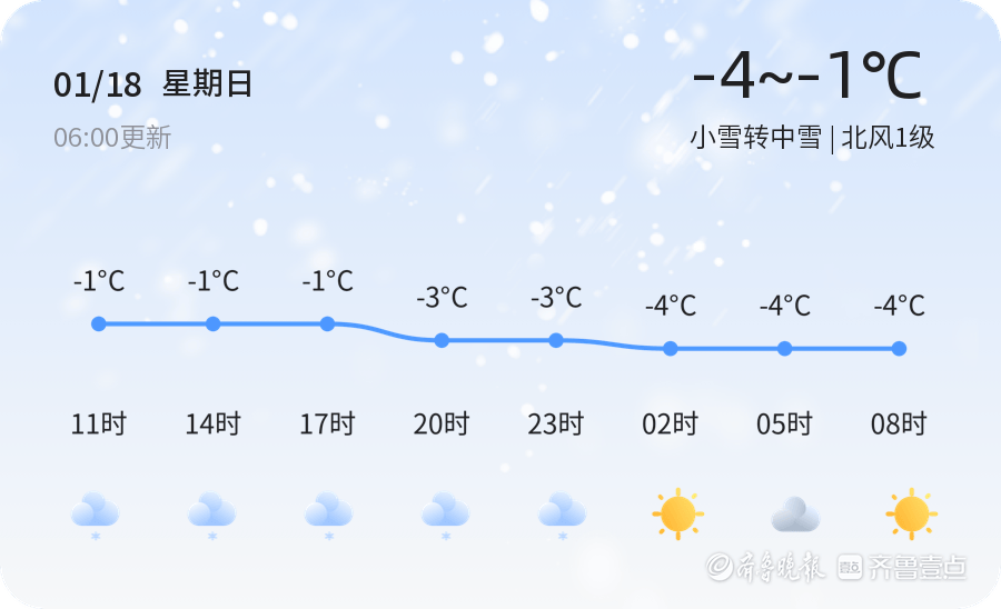 今天是2026年1月18日,星期日,农历十一月三十。济南迎来新一轮降雪天气,气温较低。今天济南各区普遍出现小雪转中雪的天气,气温在-4℃到-1℃之间,北风1级,空气湿度高达93%,PM2.5指数为58,空气质量良好。市民出行需注意保暖和交通安全。