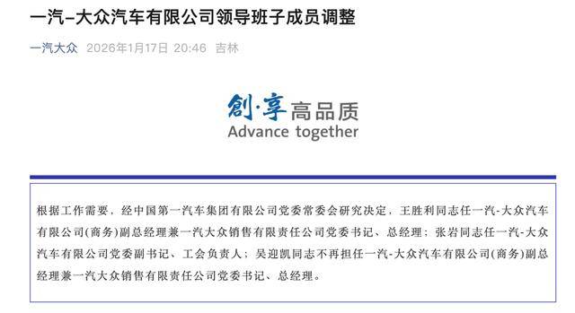 【环球网科技综合报道】1月7日晚间,“一汽大众”官微消息,根据工作需要,经中国第一汽车集团有限公司党委常委会研究决定,王胜利同志任一汽-大众汽车有限公司(商务)副总经理兼一汽大众销售有限责任公司党委书记、总经理;张岩同志任一汽-大众汽车有限公司党委副书记、工会负责人;吴迎凯同志不再担任一汽-大众汽车有限公司(商务)副总经理兼一汽大众销售有限责任公司党委书记、总经理。(勃潺)