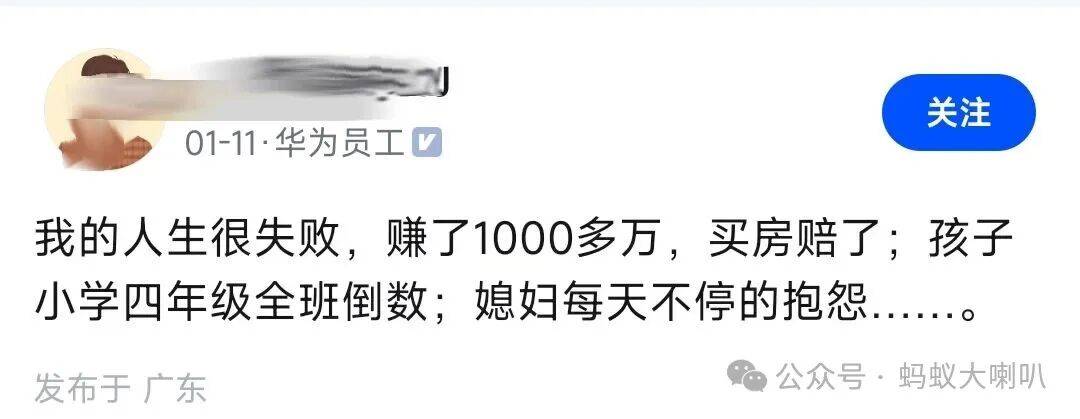 前些天看到一位华为员工发文:自嘲“我的人生很失败”。赚了1000多万,买房赔了;孩子小学四年级全班倒数;媳妇每天不停地抱怨......。