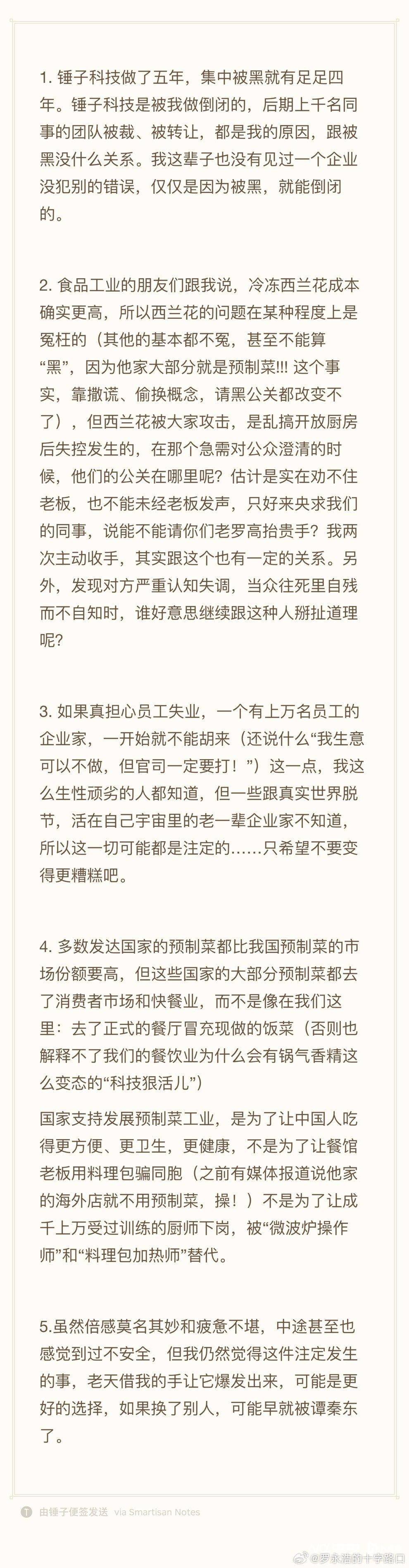 罗永浩还透露,他此前有两次主动收手,主要因为西贝的员工托他的员工求他高抬贵手。