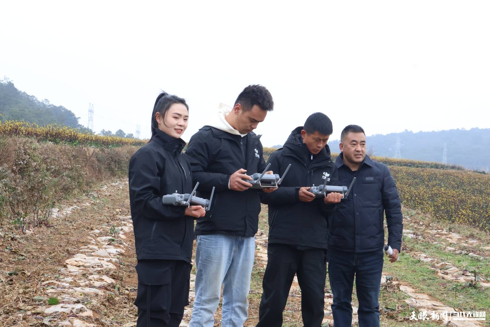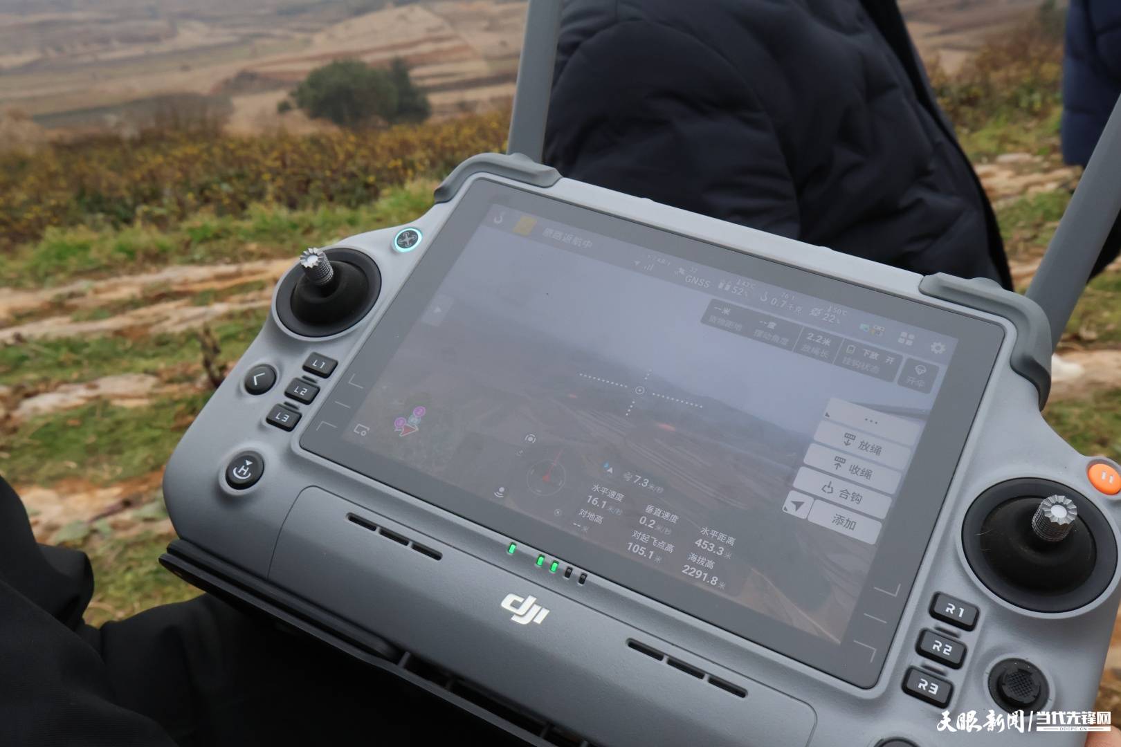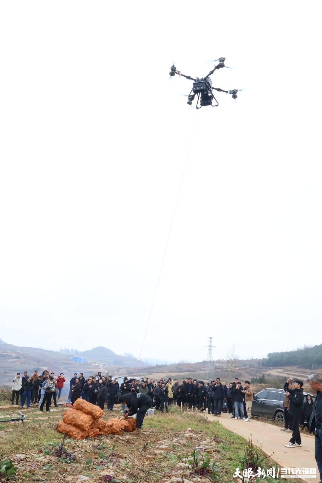 活动首站聚焦雄山街道的田间地头,这里的红菜薹、马铃薯种植基地成为无人机技术的“实战舞台”。伴随着旋翼的嗡鸣,威宁大疆无人机手管娇熟练操控农用无人机腾空而起,机身下方的喷头精准喷洒出细密雾滴,在田垄上空匀速穿梭。“这款无人机适配山地地形,雾化效果均匀,1分钟就能完成1亩地的植保打药作业,效率是人工的50倍以上。”管娇一边操作一边介绍,话音未落,无人机已完成整片地块的打药任务,盘旋着稳稳降落。紧接着,由无人机手马波和陈杰进行的吊运演示接续登场,无人机稳稳勾住装有135斤土豆的吊具,按照预设航线低空飞行,仅用1分30秒便跨越850米直线距离,将重物精准送达指定点位,全程平稳无晃动,引得现场观摩人员阵阵赞叹。