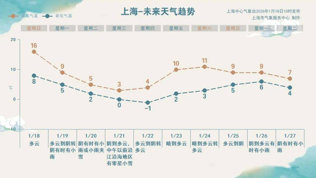 受强冷空气影响,下周初本市将有一次大风降温和雨雪天气过程。降温前后气温反差极大,明天气温不足10℃,在5~9℃之间。上午多云,下午到傍晚转阴有时有小雨,晚归注意携带雨具。