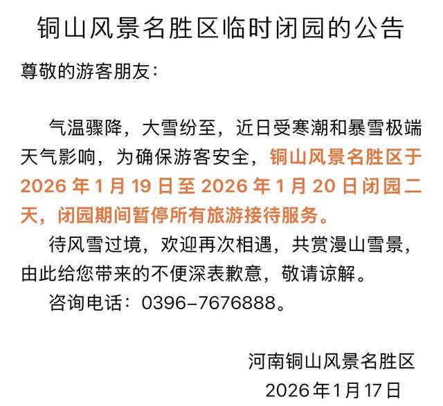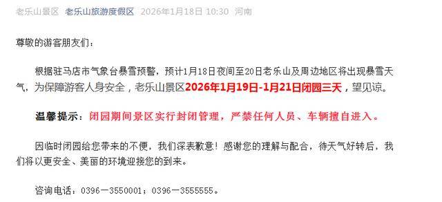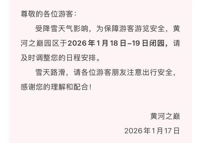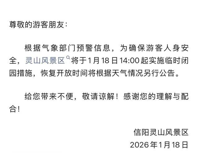 自【2026年1月18日9时】起,景区将临时关闭,暂停接待游客,恢复开放时间将根据天气情况及安全隐患排查结果另行通知。