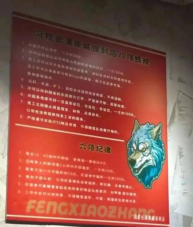 近日,位于深圳的冯校长老火锅南山保利店内张贴的《八项铁规和六项纪律》引发关注。其中,“两小时不回群消息扣20元”“宿舍吵架每人罚100元”等条款被指过于严苛,涉及员工私人生活,引发网络热议。