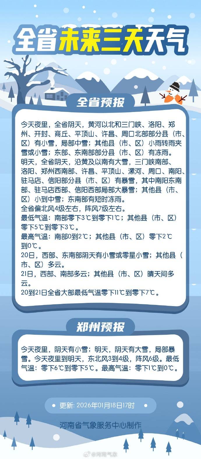 省气象台于1月18日11时发布暴雪黄色预警,根据《河南省低温雨雪冰冻灾害应急预案》有关规定,经会商研判,省防灾减灾救灾委员会决定自1月18日16时启动低温雨雪冰冻灾害Ⅳ级应急响应。