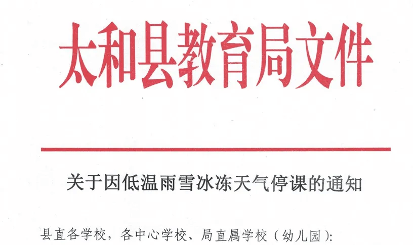 因低温雨雪冰冻天气原因,安徽界首市教育局决定全市中小学停课两日。