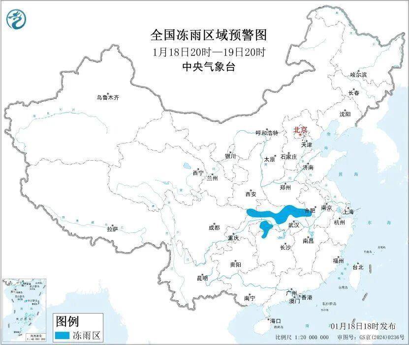 河南中南部、湖北西部、湖南、贵州、重庆东北部等地部分地区有冻雨,预计18日20时至19日20时,河南东南部、安徽西部、湖北北部和西部、陕西东南部、重庆北部等地的部分地区有冻雨或冰粒,上述大部地区冻雨量1~3毫米,山区可达3~5毫米、局地8毫米以上。18日18时,中央气象台发布冰冻黄色预警。