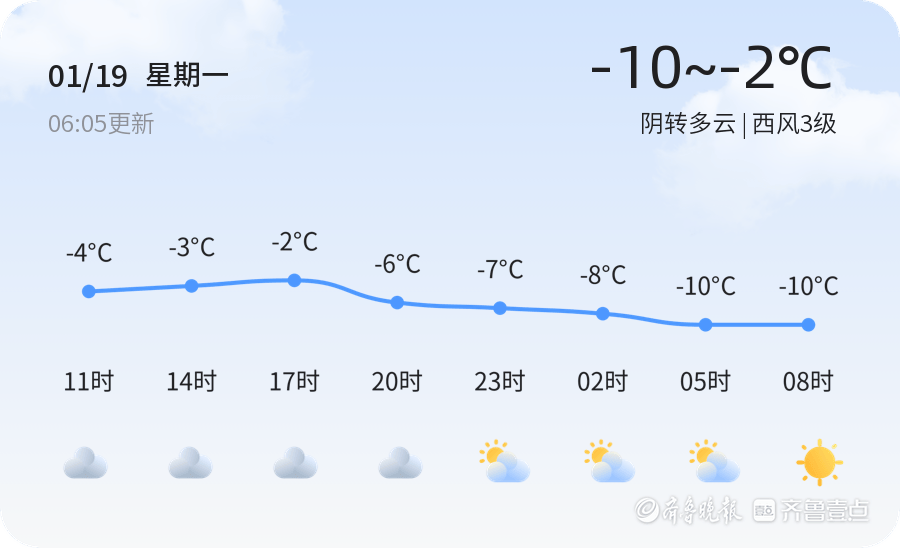 1月19日星期一农历十二月初一泰安迎来阴转多云天气今日气温在-10℃到-2℃之间西风3级空气湿度为65%空气质量指数为优适宜户外活动由于气温较低建议市民外出时做好防寒保暖措施特别是早晚温差较大注意添衣以防感冒nn据气象部门预报未来三天泰安将维持低温天气最低气温可达-11℃最高气温为-2℃市民需注意防范低温带来的不利影响明天是寒潮黄色预警持续日市区北风3-4级阵风6级山区风力更大达到4-5级阵风9级左右建议市民减少不必要的户外活动特别是体弱者和儿童更应做好防护措施nn温馨提示近期寒潮天气持续市民应密切关注天气变化及时增添衣物防寒保暖早晚温差较大建议出行时多穿衣物避免感冒同时注意防范大风天气带来的影响确保安全nn未来七天泰安天气以低温为主气温整体较低风力有时较大建议市民出行前关注天气预报合理安排出行时间做好防寒保暖措施以确保健康与安全