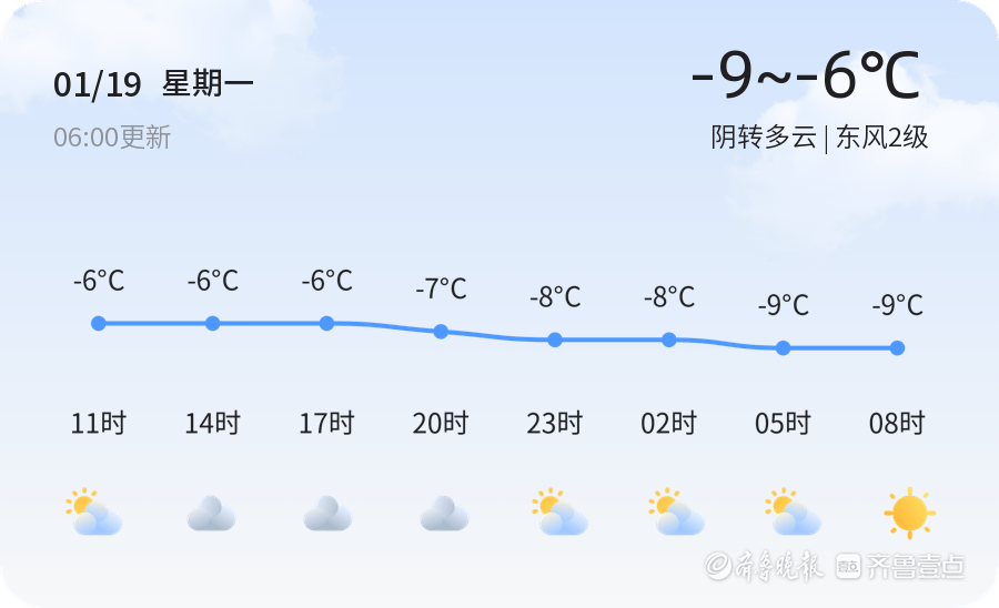 今天是1月19日,星期一,农历十二月初一。济南市迎来了一波降温天气,全市大部分地区以阴转多云为主。气温方面,今天最高气温为-6℃,最低气温为-9℃,目前温度为-5.5℃,风力较小,东风2级,空气湿度为79%,PM2.5指数为35,空气质量良好。市民朋友们请注意保暖,出行时携带雨具,以防天气变化。