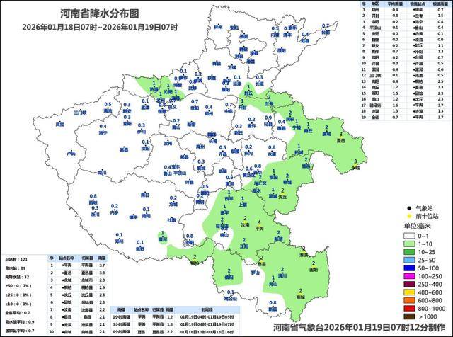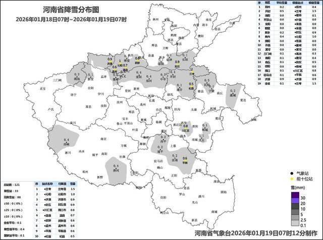 省气象台监测显示,1月18日7时至19日7时,我省大部出现小雪或雨夹雪,信阳出现小雨,最大降水量出现在平舆3.7毫米,最大降雪量出现在兰考1.5毫米。