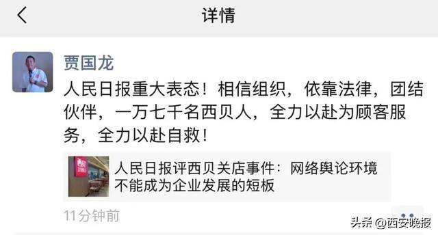 1月18日晚,贾国龙转发了人民日报发布的文章《人民日报评西贝关店事件:网络舆论环境不能成为企业发展的短板》,回应称:人民日报重大表态!相信组织,依靠法律,团结伙伴,一万七千名西贝人,全力以赴为顾客服务,全力以赴自救!