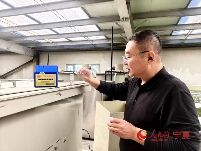 宁夏新明润源农业科技有限公司总经理王旭军测试鱼池内亚硝酸盐含量。人民网记者 李甜甜摄