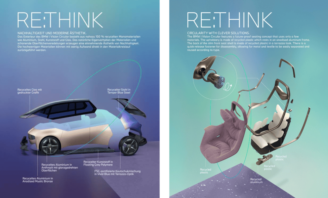 当然也有比奔驰动作更快的,就像宝马在 2021 年欧盟修改报废规则的时候,就推出过一台叫做 iVsion Circular 的概念车,除了用了很多环保的材料以外,也有个很大的卖点是它的车轮、仪表、座椅等等都没有用胶水粘接,很容易就能拆开。