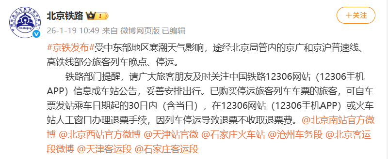 受中东部地区寒潮天气影响,途经北京局管内的京广和京沪普速线、高铁线部分旅客列车晚点、停运。