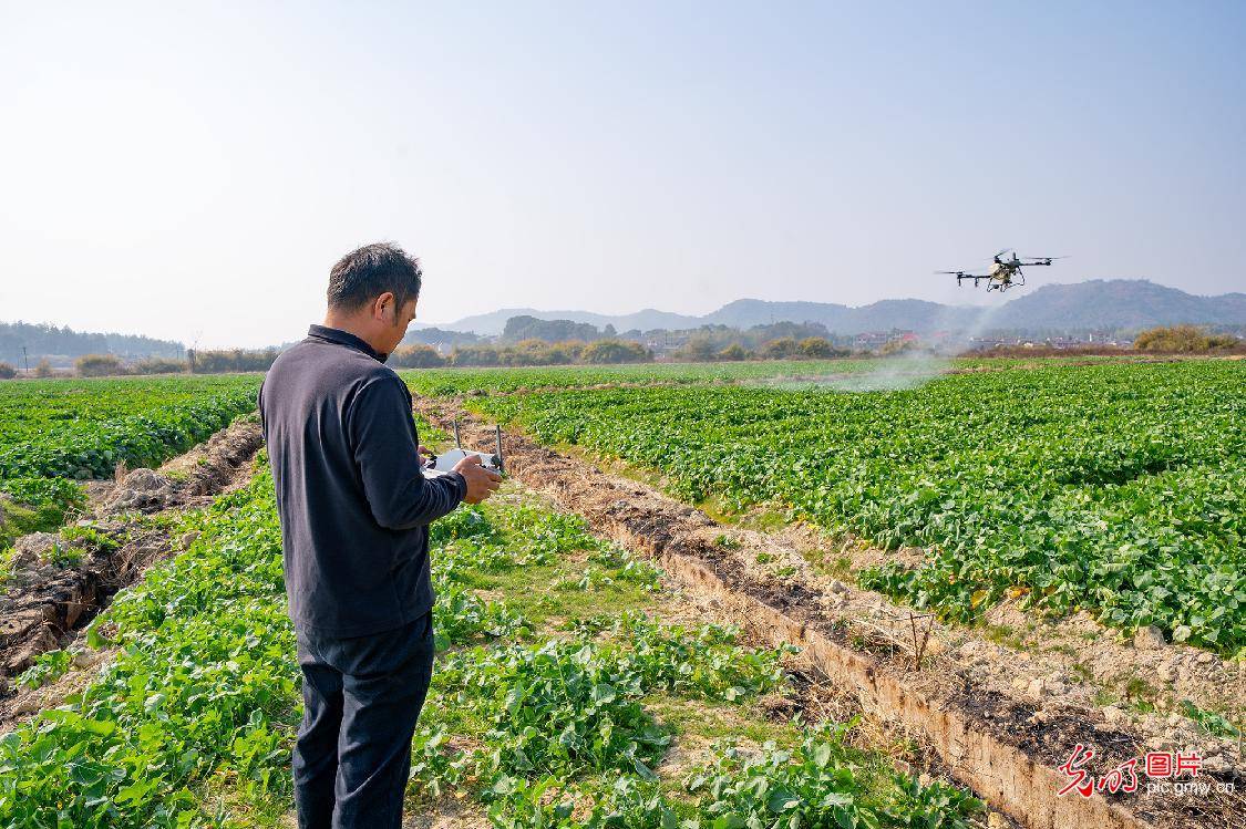 2026年1月18日,在江西省金溪县双塘镇柏林村委会北斗村的千亩油菜地里,农艺师正在利用无人机追施冬肥,以进一步促进油菜根系发育,增强油菜抗寒能力。近年来,当地进一步加大人才强县和科技兴农力度,一批批新型农民正利用农业机械和数字科技从事着农业生产和经营。(李山冕摄/光明图片)