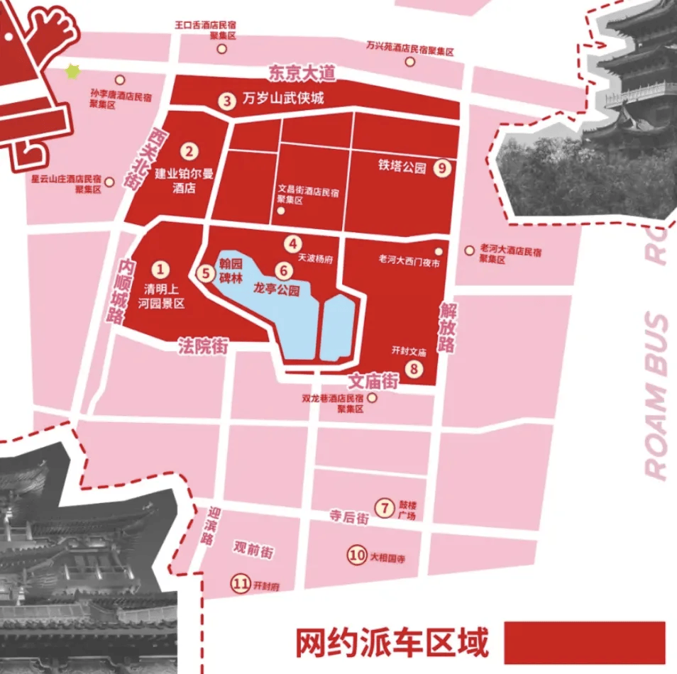 开封公交推出的新型公交专线——开封ROAM BUS-乐游专线将于12月28日试运营,其间体验票价3元。运营范围分为可网约区域与巡游线路两部分。其中,可网约区域重点覆盖宋都皇城旅游度假区,包括万岁山武侠城、清明上河园、铁塔公园、龙亭公园、翰园碑林等核心景区,游客可通过手机小程序预约、网上购票或到站点直接乘坐。巡游线路试运营期间支持站点招手即停,沿途串联大相国寺、延庆观、开封府、鼓楼广场夜市等多个热门地点。