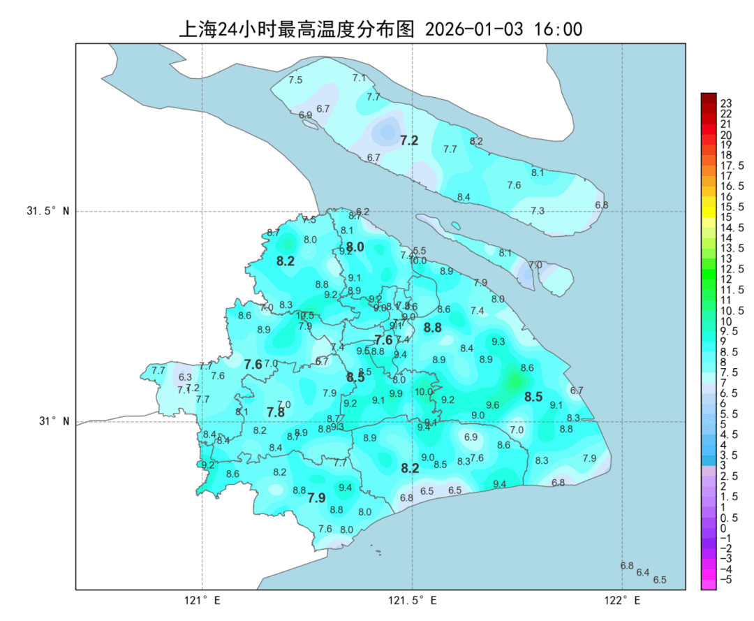 今晨气温再度刷新入冬新低,郊区最低气温多在零下8度到零下3度之间,崇明零下7.4度为全市最低。市区徐家汇站零下0.9度,今冬首次跌破冰点。太阳登场后升温明显,徐家汇站最高气温来到7.6度,浦东站8.8度为全市最高。