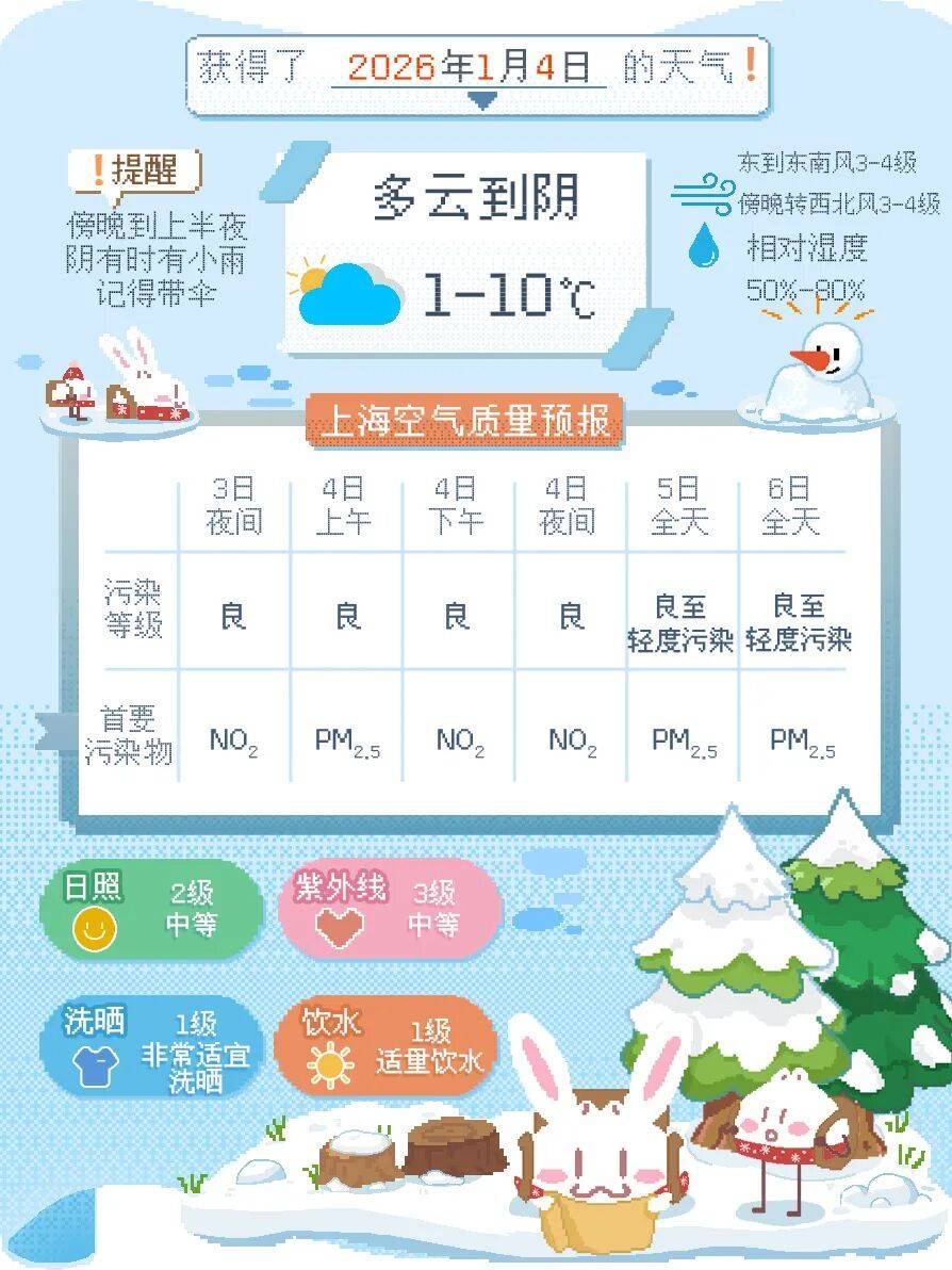 小雨会持续至5日,下周一早上部分地区有可能出现雨夹雪天气,中午降水过程结束。周二起天气转晴,受到冷空气扩散影响,风力明显增大,体感会更冷。下周工作日气温波动不大,最低气温在2-4度之间,最高气温在8-12度。周六前后还会有冷空气影响上海。晴多雨少的天气,提醒大家注意用火用电安全。