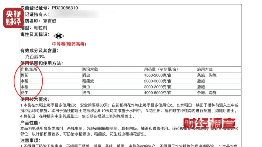 然而,这些标明作物(或范围)为花生、水稻或棉花的克百威,却被一些商家直接销售给蔬菜种植户。
