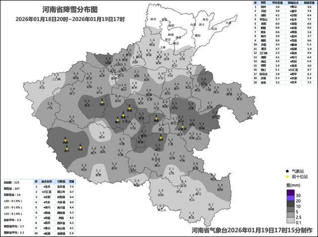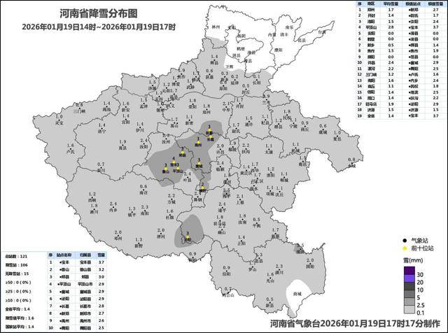 其中,19日14时至17时,我省大部出现小雪,平顶山、许昌部分县(市、区)出现中雪,降雪量位列前三的分别为宝丰3.7毫米、鲁山3.2毫米、郏县3.0毫米。