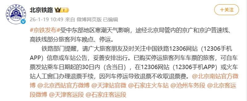 受中东部地区寒潮天气影响,途经北京局管内的京广和京沪普速线、高铁线部分旅客列车晚点、停运。