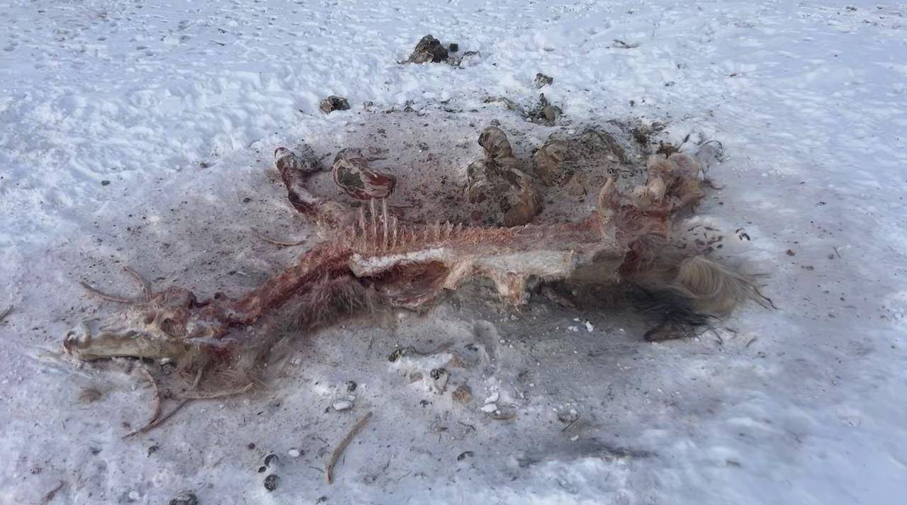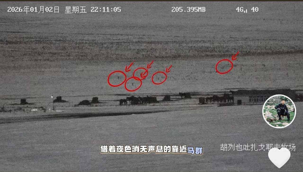 据牧民扎戈耶夫介绍,事发1月2日晚10时许,因为当晚有月光,红外高清监控里能够看到他家的马群正在自家牧场上吃着捆草,突然五六匹草原狼趁着夜色悄无声息地靠近马群,马群惊散夺命奔跑,狼群奔跑追逐围攻,两匹成年马就这样被群狼咬死。父亲第二天发现有马匹丢失,扎戈耶夫5日才从外地赶回来拍照拍视频,这时马儿已被狼群啃食得只剩下骨架了。
