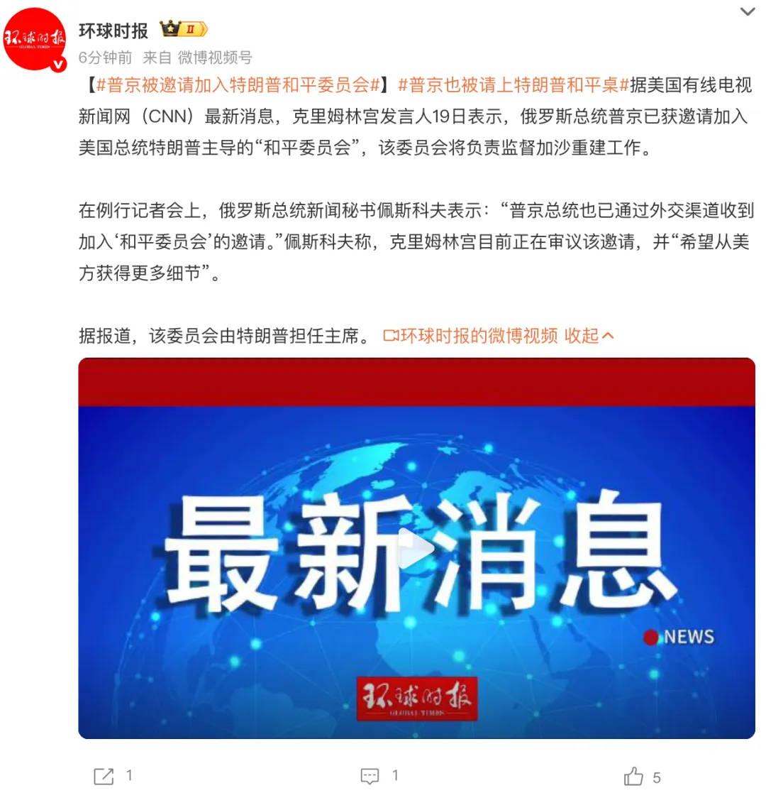 据美国有线电视新闻网(CNN)最新消息,克里姆林宫发言人19日表示,俄罗斯总统普京已获邀请加入美国总统特朗普主导的“和平委员会”,该委员会将负责监督加沙重建工作。