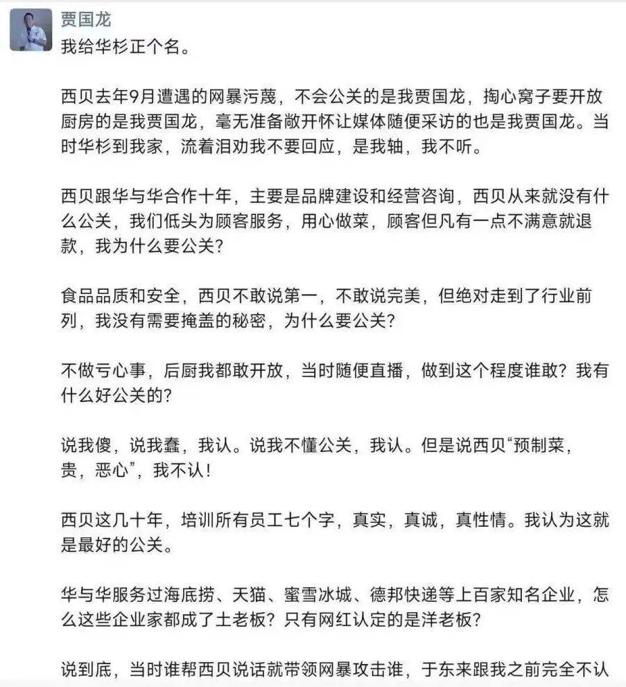 “我贾国龙不懂公关,我是一个踏踏实实做了38年实业,带领一万七千人为顾客做服务的人,我为什么要懂公关?是不是这个世界上不会诡辩的普通人就该被欺辱?”