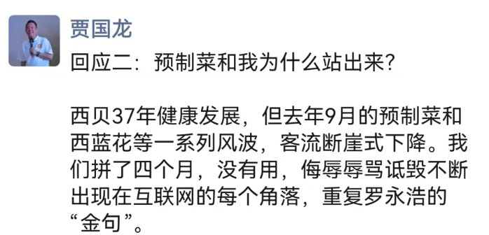贾国龙称:“西贝要关102家门店,我仅仅在朋友圈里回复自己的朋友一声,根本都没在网上说话。结果罗永浩再次在微博上掀起巨浪,发长文再次一口咬定西贝是预制菜,让我和西贝员工遭到无数辱骂,让本已千疮百孔的西贝雪上加霜。”