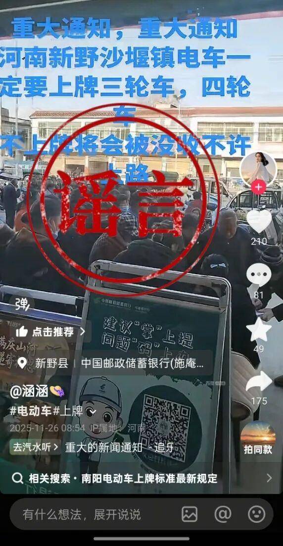 11月26日,南阳警方在工作中发现,新野县网民彭某为博取眼球,在抖音平台发布“新野沙堰镇电车一定要上牌,三轮车、四轮车不上牌将会被没收不许上路”的虚假贴文,造成不良社会影响。目前,公安机关已依法对彭某作出行政罚款的处罚。
