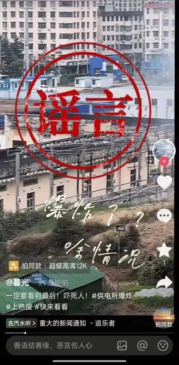 11月10日,南阳警方在工作中发现,南召县网民孙某某为博取眼球,在抖音平台发布南召一供电所着火视频,并配文“供电所发生爆炸”。经核实,该事件实为供电所院墙外电缆因线路老化被击穿产生烟雾,并非爆炸,孙某某发布内容为虚假信息,造成不良社会影响。目前,公安机关已依法对孙某某作出行政罚款的处罚。