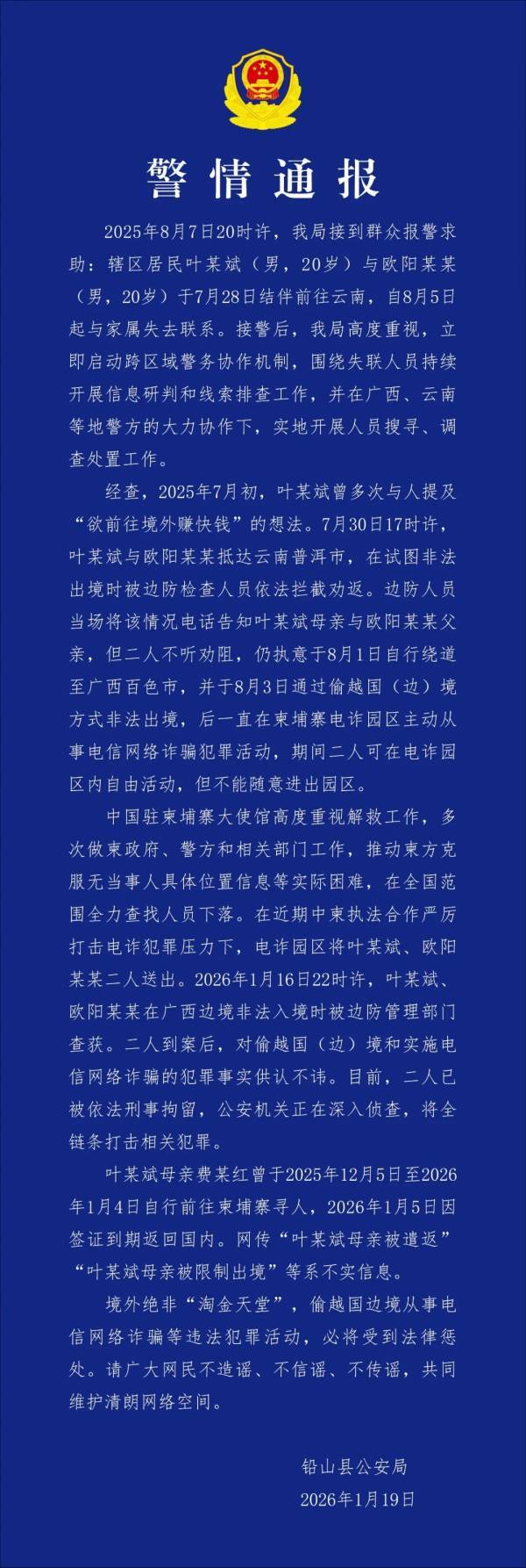 19日,江西省上饶市铅山县公安局发布警情通报称,2026年1月16日22时许,叶某斌、欧阳某某在广西边境非法入境时被边防管理部门查获。二人到案后,对偷越国(边)境和实施电信网络诈骗的犯罪事实供认不讳。