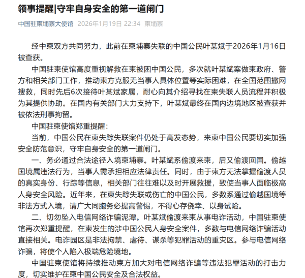 19日晚,中国驻柬使馆发布消息说,中国驻柬使馆高度重视解救在柬被困中国公民,多次就叶某斌案做柬政府、警方和相关部门工作,推动柬方克服无当事人具体位置等实际困难,在全国范围撒网搜救,同时先后6次接待叶某斌家属,耐心向其介绍寻找在柬失联人员流程并积极为其提供协助。在国内有关部门大力支持下,叶某斌最终在国内边境地区被查获并被依法刑事拘留。