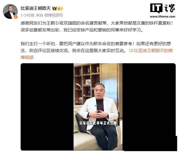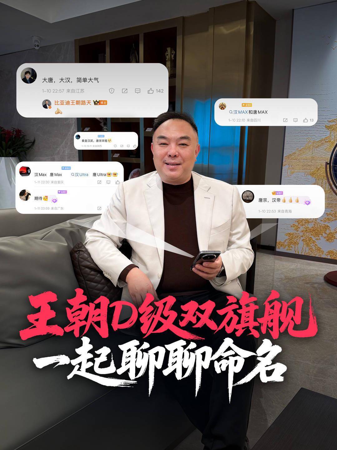 IT之家 1 月 18 日消息,比亚迪王朝网销售事业部总经理路天今日透露,已收到了很多网友关于旗舰车型汉 9 系和唐 9 系的命名,要把用户建议作为新车命名的首要参考。