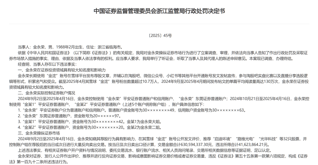 行政处罚决定书显示,金永荣(男,1988年生)长期使用“金浤”账号发布荐股文章,并辅以在微信公众号、小红书等其他平台开通账号发文发帖宣传,参与淘股吧实盘比赛以及直播分享选股逻辑等形式,积累名气和受众。截至2025年4月其雪球“金浤”账号粉丝数量超过10.7万人,2024年9月至2025年4月期间发布帖文的单篇平均阅读量高达130万次,金永荣在证券投资领域具有较大知名度和影响力。
