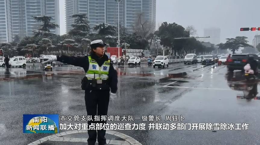 面对恶劣天气,南阳市公安局交通管理支队指挥调度大队闻雪而动、迅速响应,对城区商圈、学校、医院周边等人员车流密集区域,加大视频巡逻和指令调度频次,并指导路面民警坚守一线,利用现场指挥、喊话提醒等方式,引导车辆减速慢行、有序通行。