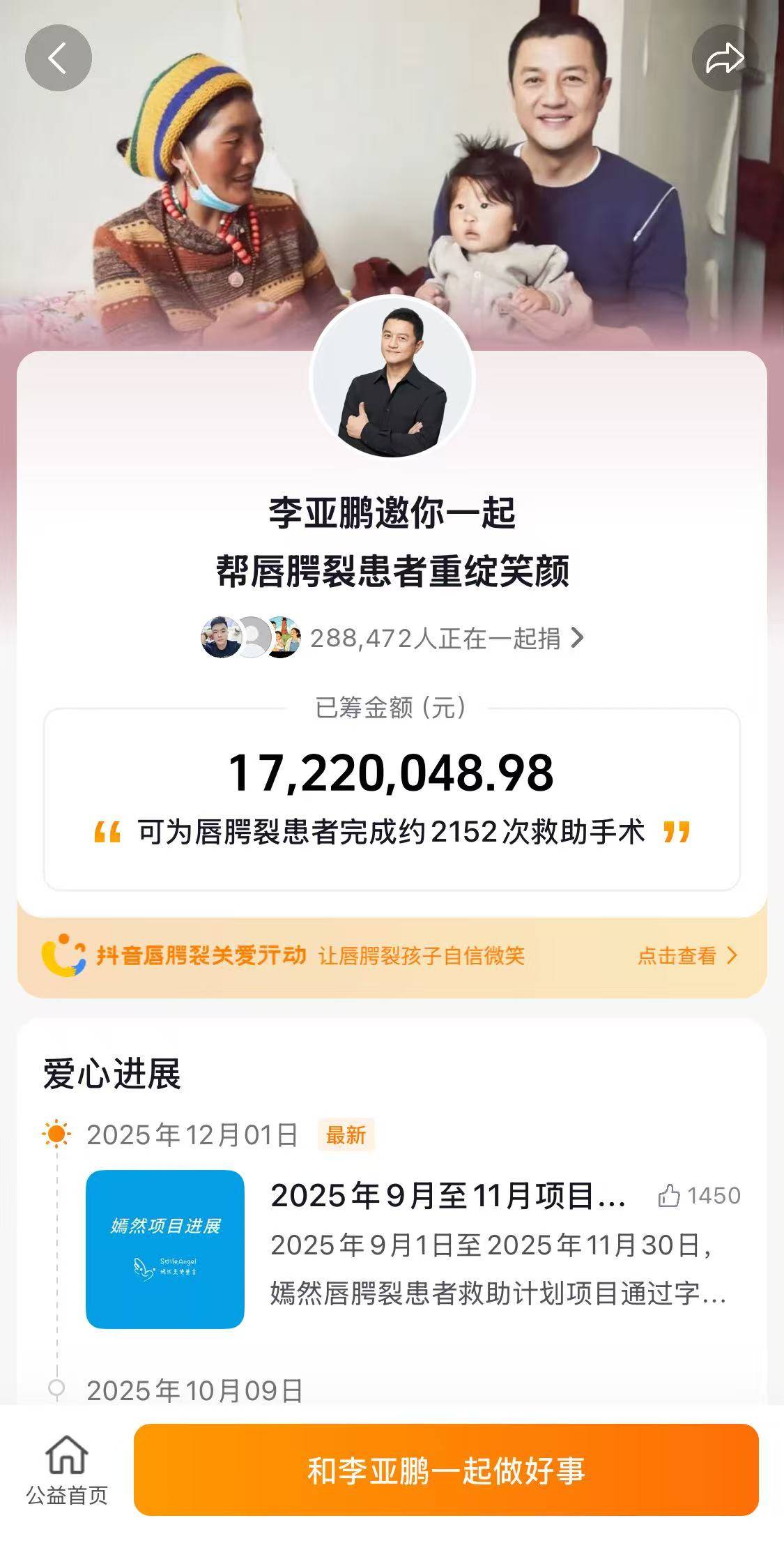 截至1月18日21时,抖音平台上“李亚鹏邀你一起帮唇腭裂患者重绽笑颜”公益项目累计已筹集约1722万元。下方有网友留言“凑够2600万,医院必须不能关门”“希望医院继续开下去”。不过,该项目最早可见的上线时间为2013年11月,上述金额为近年累计所得。