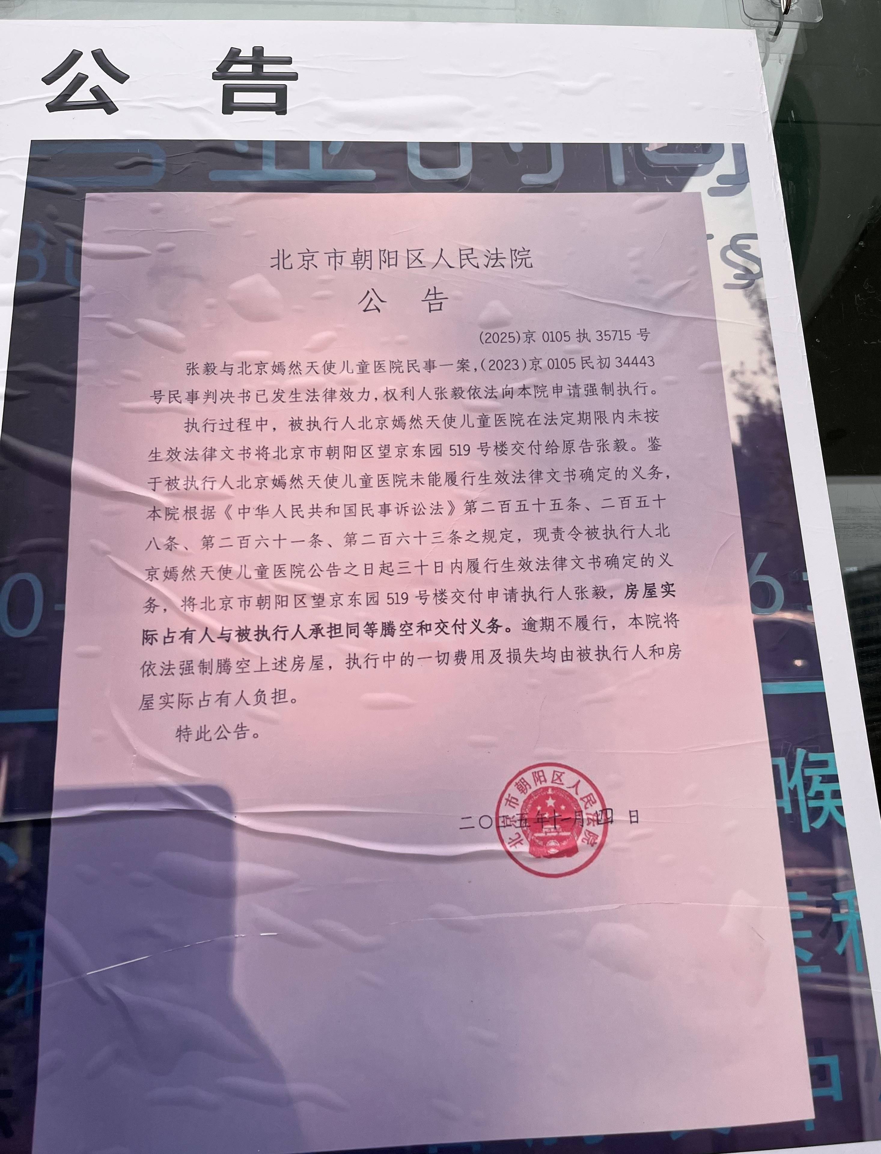 嫣然医院门口的玻璃上贴着法院的公告。 新京报记者 徐鸣 摄