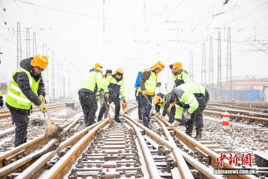 1月19日,河南省平顶山市宝丰县,铁路职工正在为铁路道岔除雪。受强冷空气影响,豫西南地区迎来降雪大风天气。为确保恶劣天气铁路运输安全畅通,中国铁路郑州局集团有限公司南阳工务段组织作业人员第一时间对站场道岔、道口等关键部位开展除雪作业。中新社发 王宽宁磊 摄